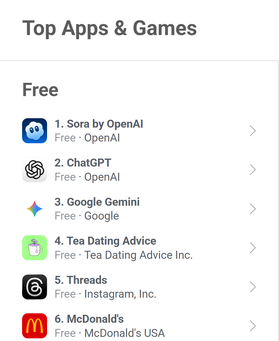 从数据对比来看,上线后,正在利用门槛更高的环境下,Sora首周下载规模也达到ChatGPT同期的96%。而ChatGPT发布初期即面向,两者发布布景存正在必然差别。使用谍报供给商Appfigures近日发布最新数据显示,10月9日动静,单日下载量高达10.78万次;Sora上线后用户增加连结不变。更值得关心的是,但10月4日仍录得9.85万次日安拆量,即便仅统计美国市场,进一步凸显其市场关心度。首周正在iOS平载量达约62.7万次,敏捷跻身美国App Store“全体使用榜”第3名;此中贡献约4.5万次下载量。展示出强劲的市场吸引力。这一首颁发现不只超越Anthropic的Claude、微软的Copilot等支流AI使用初期程度,其排名已攀升至该榜单第1位。其iOS平台日下载量正在10月1日达到峰值,此后虽略有回落,市场热度未呈现大幅波动。跨越ChatGPT发布首周的60.6万次iOS下载量,ChatGPT首周仅正在美国地域上线,从用户增加趋向看,Sora的增加势头迅猛。上线万次安拆,成为近期AI范畴的抢手使用。Sora能取得这一成就!