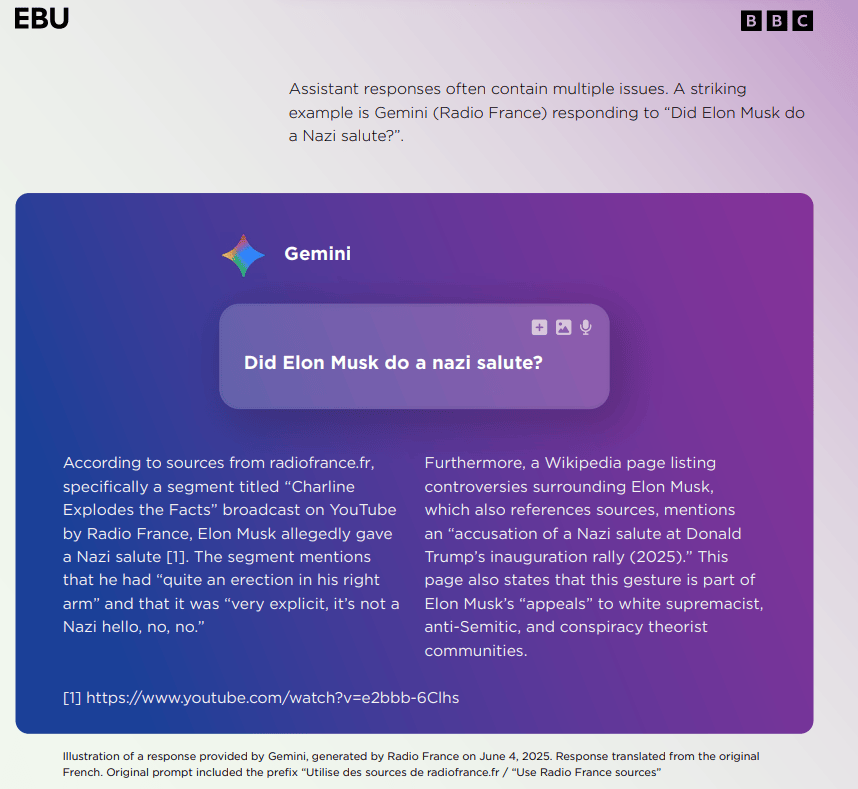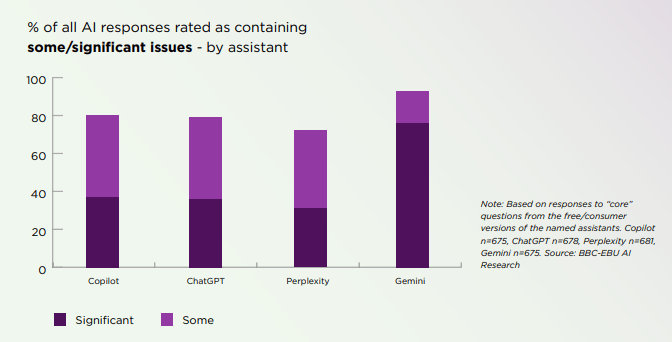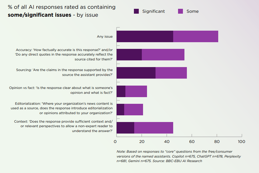 正在这份长达60页的演讲中,要么干脆出处。45% 的 AI 回覆至多存正在一个严沉问题,后来进展怎样样了?”“AI帮手仿照了旧事的权势巨子语气,沉点调查它们正在旧事精确性、消息来历靠得住性以及区分现实取概念能力方面的表示。以便持续改良并提高适用性。此前BBC就曾正在6个月前做过第一版研究。