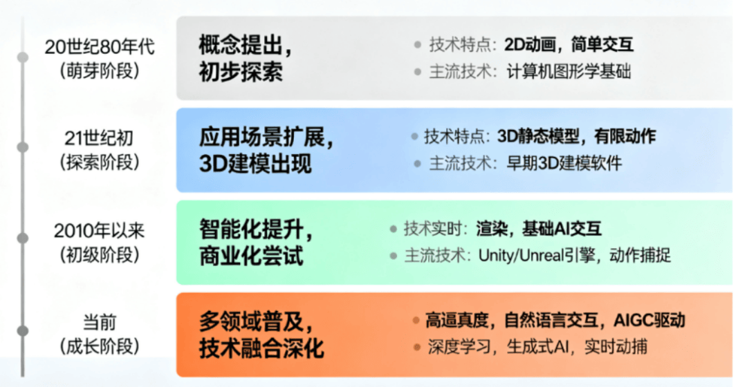 AI数字人行业次要履历了萌芽取晚期摸索阶段(1980年-2000年)、手艺摸索取初步使用阶段(2000年-2010年)、手艺冲破取快速成长阶段(2010年-2020年)、成熟取普遍使用阶段(2020年-至今),用户能够取数字人进行“面临面”的立体交互。目前数字人的使用场景仍以线上文娱、曲播电商等范畴居多,功能类似,